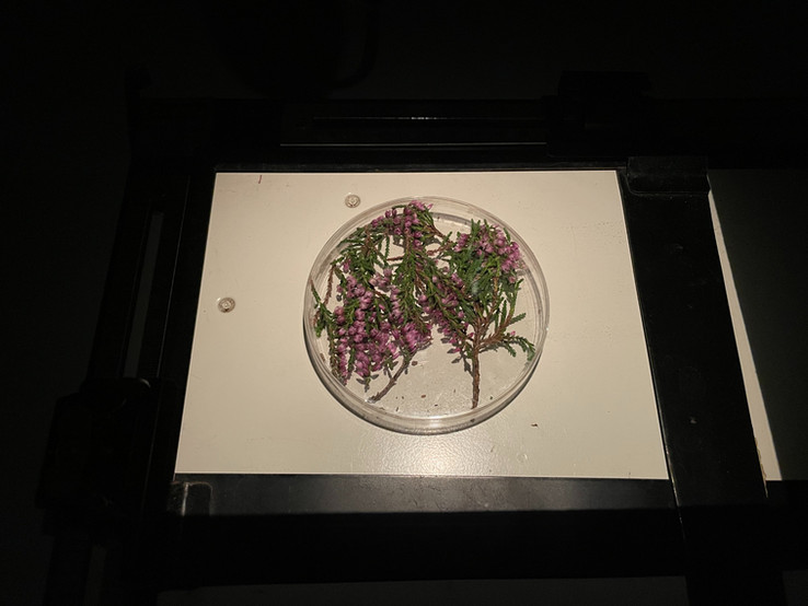 I set up my new darkroom space within my garage and began testing the exposure time. I was looking at around a very quick exposure time of two seconds however, I decided to turn down the aperture a couple of clicks to reduce this quick light reaction. Keeping the samples in the petri dish would continue with this idea of centralising the sample within the frame of the image. I did not put the whole sample into the petri dish as this would not work well for a photogram. It would look muddled and chaotic and although the samples may not come out clean, reducing space for light to pass through is important for this type of work. With all photographic dark room work, this series was a working experiment. Many samples would be photographed (photogram) and all would take some alterations with the quantity of sample, exposure, and focus. One issue that occurred early on was that I was noticing a double edge on the border of the petri dish. My sample looked like it was escaping and or sat within the border. I came to realise that this was due to the depth of the petri dish. The base of the dish has a higher wall and so I decided to use the roof of the dish which is lower in depth. Low and behold this swap worked and the border became shallower and refined. You can see the differences in the images below.